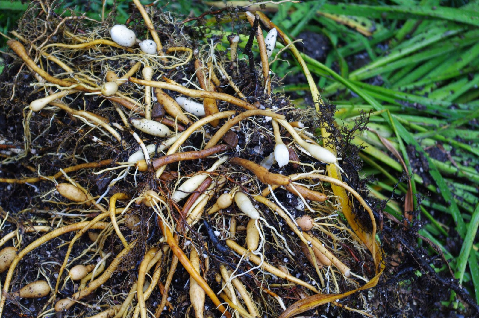 Now washing the roots one see the pathognomonic orange colored root and runner structures. One can see the attack on the former plant. The H fulvas seem to focus on certain hybrids. I have lost about a dozen so far to this attack. Species seem to be immune at least as of now.